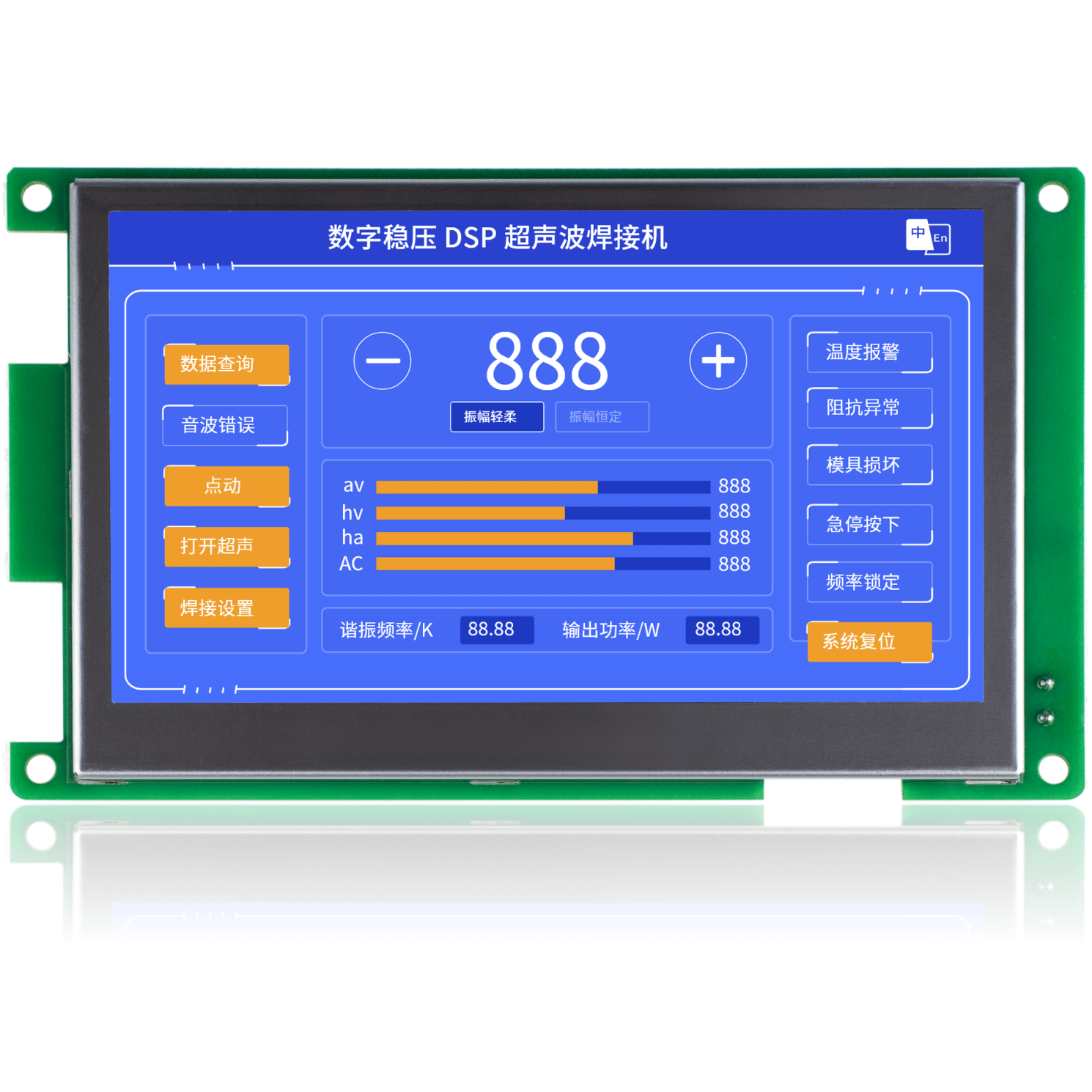 金璽HMI應(yīng)用在超聲波控制上,安裝在控制機(jī)箱上對(duì)超聲波進(jìn)行數(shù)據(jù)設(shè)定和監(jiān)控。